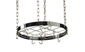 Finish OptionBlue Hook Finish OptionChrome Gourmet Round Pot Rack with Grid Great for smaller kitchens Care instruction Dust and use soapwater as necessary Includes 6 eye hooks 2 grid hooks 4 pieces of 18 chain 4 ceiling hooks Color BlueChrome Great for smaller kitchens Includes 6 Ey