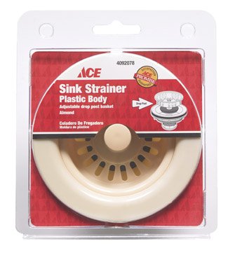 ACE BASKET STRAINER Fits 3-12 dia hole Plastic basket with drop stick post Neoprene stopper Almond Fits 3-12 dia Hole Plastic basket with drop stick post Neoprene stopper Bagged Almond